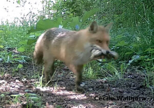 La qualité de cette photo n’est pas au top ; néanmoins, on peut identifier, replié dans la gueule de ce renard, le corps d’un serpent. Il s’agit non pas d’un renard mais d’une renarde et dans sa gueule, sa proie, une couleuvre verte et jaune. La scène a été captée en mai 2025 alors que cette renarde alimentait ses renardeaux. Opportunisme ? Assurément ! Si l’alimentation de base du renard est le rongeur (notamment les campagnols), il ne dédaigne pas d’autres proies, surtout lorsqu’il a des bouches à nourrir ! Mais de là à se servir dans une population de couleuvres… ce fut tout de même marquant. D’autant que la caméra ne l’a pas surpris une seule fois avec une telle proie mais plusieurs fois… De toute évidence, les renardeaux ont apprécié puisque cet automne, je relevais sur le passage habituel de deux des renardeaux encore présents sur le territoire de leurs parents, les restes d’une autre couleuvre…